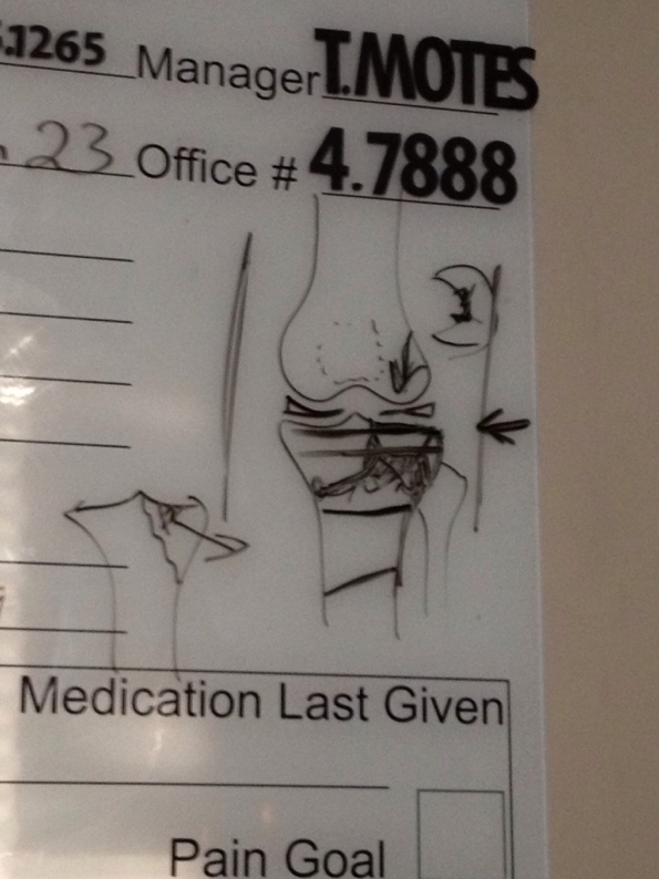 I wasn’t a huge priority, because I wasn’t dying and they wanted to make sure the swelling had gone down before trying to operate. So for three days, I was high as a kite on pain medication. Morphine, Percocet, OxyContin – the works. A lot of really great people made their way in and out of my drug lair during that time, and sometimes, those visits are very blurry.